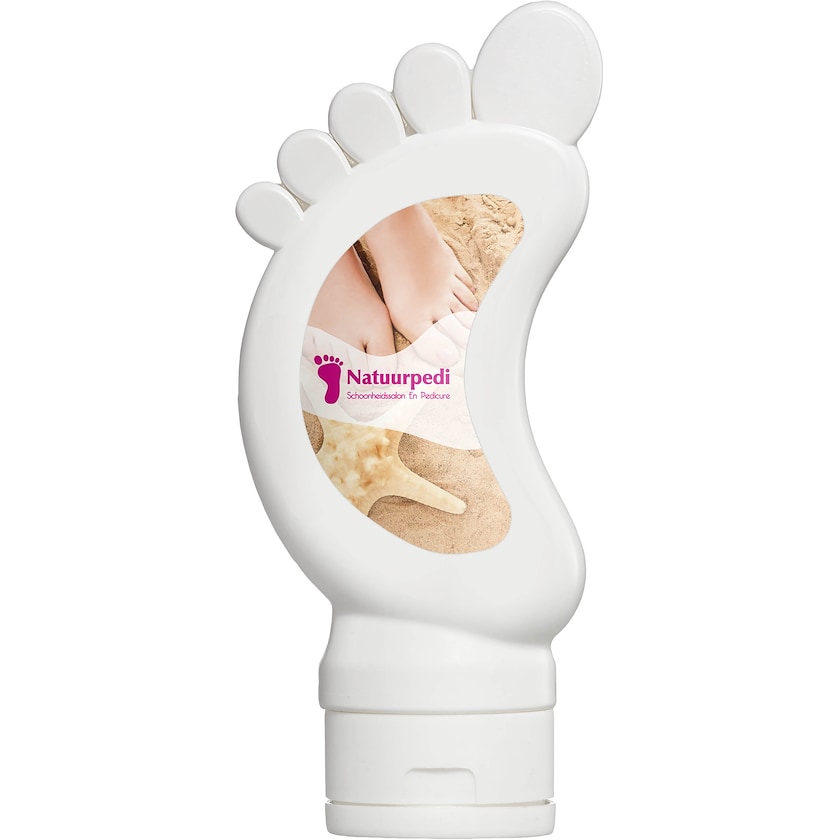 Crema nutriente per piedi in tubetto a forma di piede. Questa crema profuma di mentolo ed ha un effetto rinfrescante e idratante. Si tratta di una crema dermatologicamente testata e prodotta in Germania nel rispetto della European Cosmetics Regulation 1223/2009/EG. Sul tubetto è attaccata un'etichetta con la tua stampa.