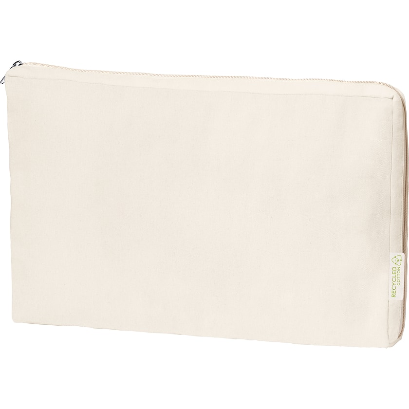 Custodia per PC in cotone riciclato personalizzata. Clarkson è imbottita ed è adatta a PC ridimensioni fino ai 15 pollici. Sul lato corto si trova un'etichetta che ne indica la composizione in cotone riciclato.