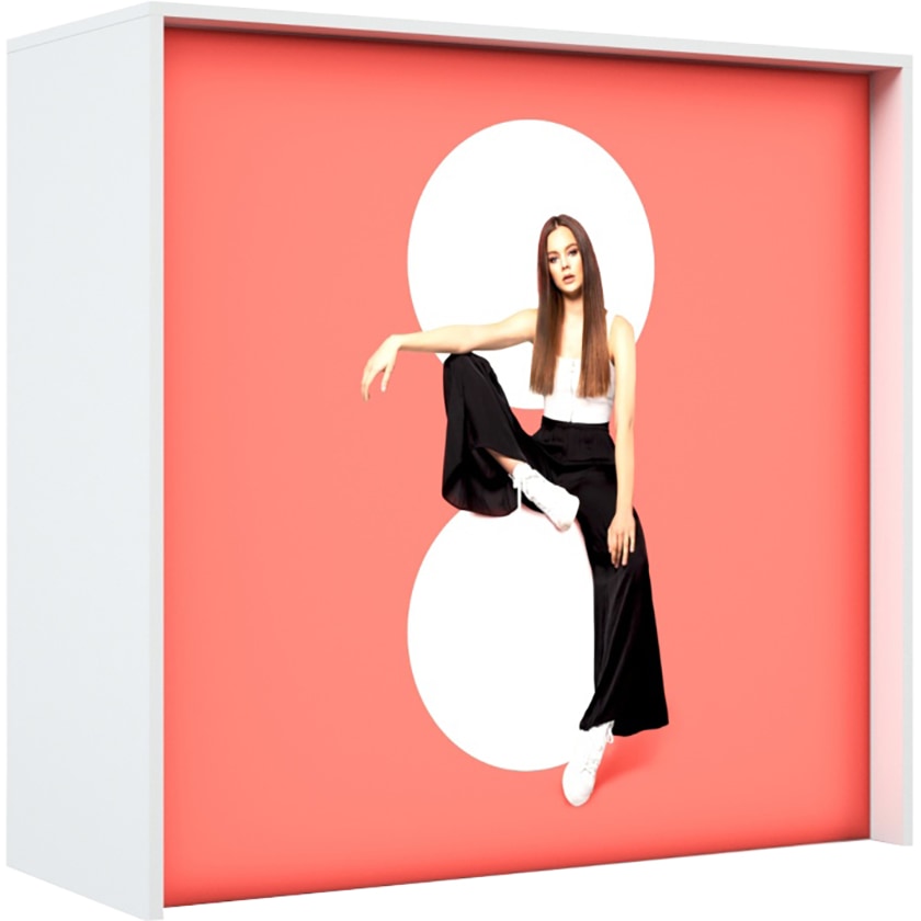 Banchetto da fiera personalizzato illuminato a LED. Il banchetto ha una tenda in tessuto intelligente con luci LED che illuminano la tua fantasia. Il montaggio non richiede alcun attrezzo, il montaggio è realizzato incastrando le parti insieme. Quando vuoi cambiare la fantasia ti basterà ordinare un nuovo tessuto. Una pratica custodia con ruote è inclusa.