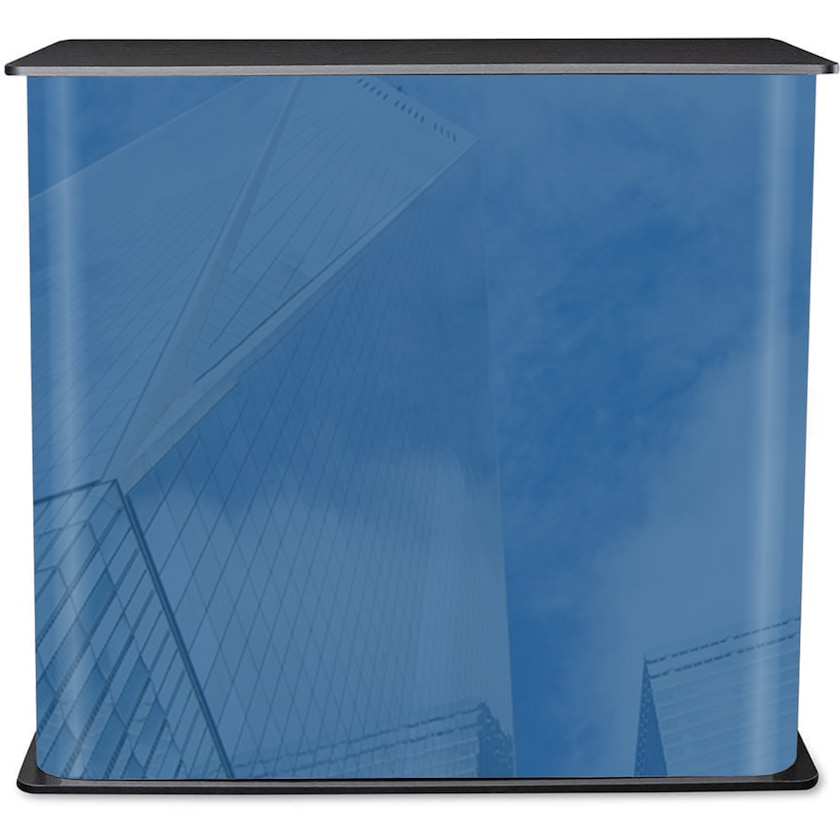 Banchetto da fiera rettangolare con struttura intelligente. Expo Counter è dotato di un un piano da tavolo in legno e di una parte inferiore in PVC rivestito in velcro. La personalizzazione viene realizzata su una superficie laminata posizionata sulla parte inferiore. Scegli tra laminazione lucida o opaca. Custodia inclusa senza costi aggiuntivi.
