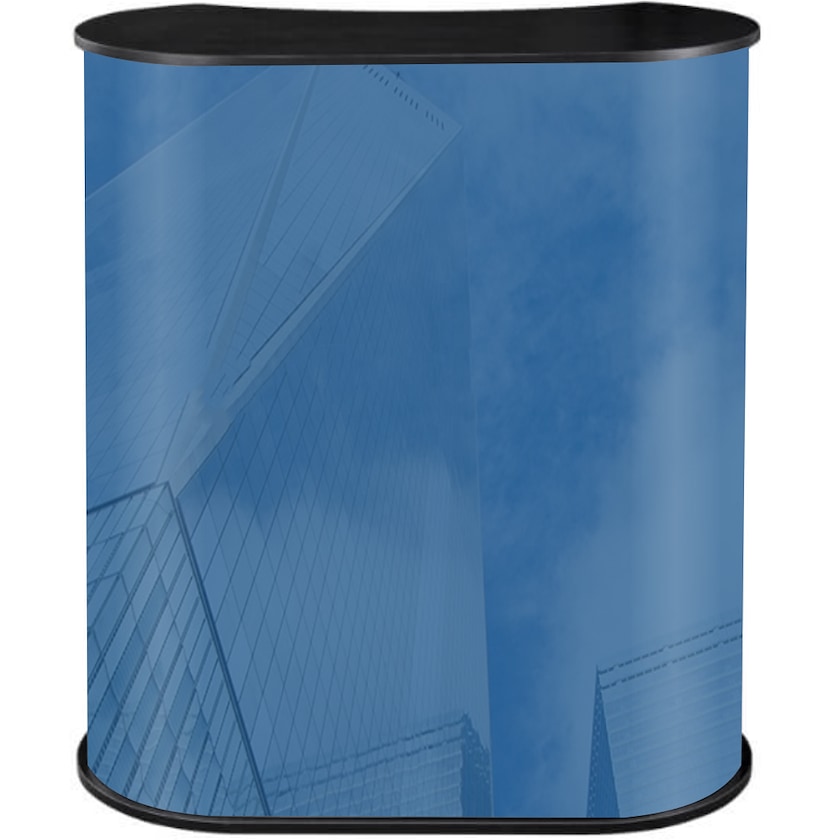 Popolare banchetto da fiera dalla forma curva. Expo Curved ha una pratica struttura con un piano da tavolo in legno e una parte inferiore in PVC rivestito in velcro. La personalizzazione viene realizzata su una superficie laminata posizionata sulla parte inferiore. La superficie laminata può essere lucida o opaca. Il banchetto è facilmente trasportabile nella custodia inclusa.