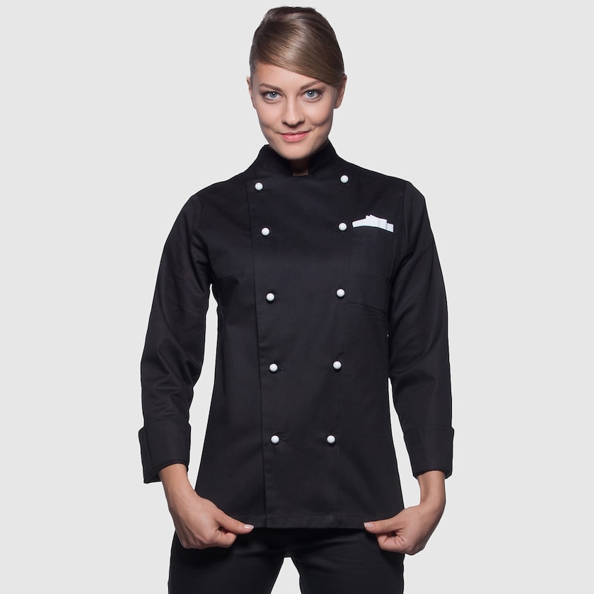 Giacca da cuoca. Questa giacca è caratterizzata da una vestibilità aderente e viene tenuta chiusa da 10 bottoni (non inclusi). Sul petto a sinistra si trova un taschino. Questa giacca resiste a lavaggi industriali fino a 95 gradi. Disponibile anche in versione da uomo.