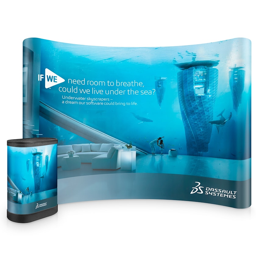 Set con espositore Pop Up Large, banchetto e illuminazione. Questo espositore ha un'elegante forma arrotondata. Per il montaggio è necessaria solo una persona e non c'è bisogno di attrezzi. Il tessuto viene assicurato sulla struttura grazie a dei magneti. Il prezzo include sia la stampa sul banchetto che sull'espositore. Su quest'ultimo la stampa viene realizzata sul davanti così come su entrambi i lati corti. Il banchetto è provvisto di ruote e funge anche da contenitore.