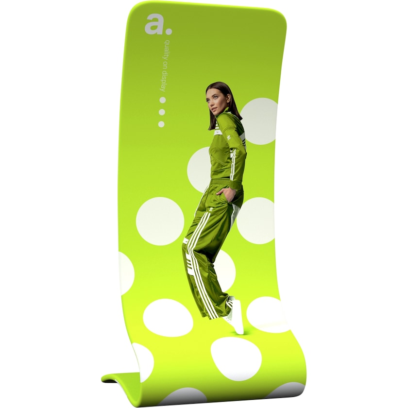 Espositore a parete dall'interessante forma a S. L'espositore ha una pratica struttura in tubi di alluminio che si montano in un arco. Il montaggio può essere effettuato completamente senza attrezzi. Dopo che l'arco è stato montato si tira il tessuto su di esso e si chiude con una cerniera. Il tessuto viene personalizzato con colori ecologici a base d'acqua sia sul lato anteriore che posteriore. Se necessario il tessuto può essere lavato in lavatrice a 30 gradi. Se in futuro vorrai cambiare la fantasia ti basterà ordinare un nuovo tessuto.