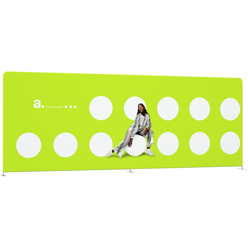 Enorme espositore a parete largo 600 cm. L'espositore a parete ha una pratica struttura in tubi di alluminio che si montano in un arco. Il montaggio non richiede alcun attrezzo ed è molto semplice. Il tessuto, che viene personalizzato secondo le tue istruzioni, viene tirato poi sull'arco e si chiude grazie a una cerniera. Il risultato è un espositore a parete senza pieghe o rughe. Il tessuto può essere lavato in lavatrice a 30 gradi. Se vuoi poi cambiare la fantasia dell'espositore puoi semplicemente ordinare da noi un nuovo tessuto personalizzato.