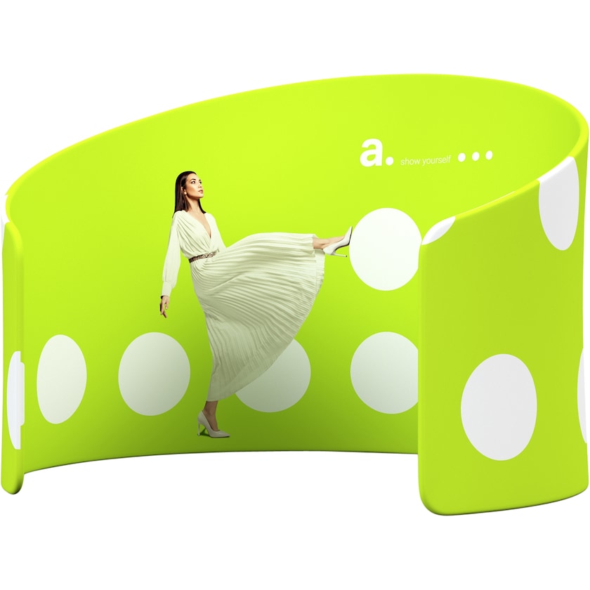 Espositore a parete tondo che crea un effetto stanza. La struttura dell'espositore è costituita di tubi di alluminio che si montano in un arco. Le parti si montano completamente senza attrezzi. Il tessuto, che forniamo personalizzato con la tua stampa, si tira sull'arco e si chiude con una cerniera. La stampa viene realizzata con colori a base d'acqua sul lato anteriore e posteriore. Il tessuto può essere lavato in lavatrice a 30 gradi se necessario. Vuoi avere più fantasie? Ordina semplicemente da noi un altro tessuto.