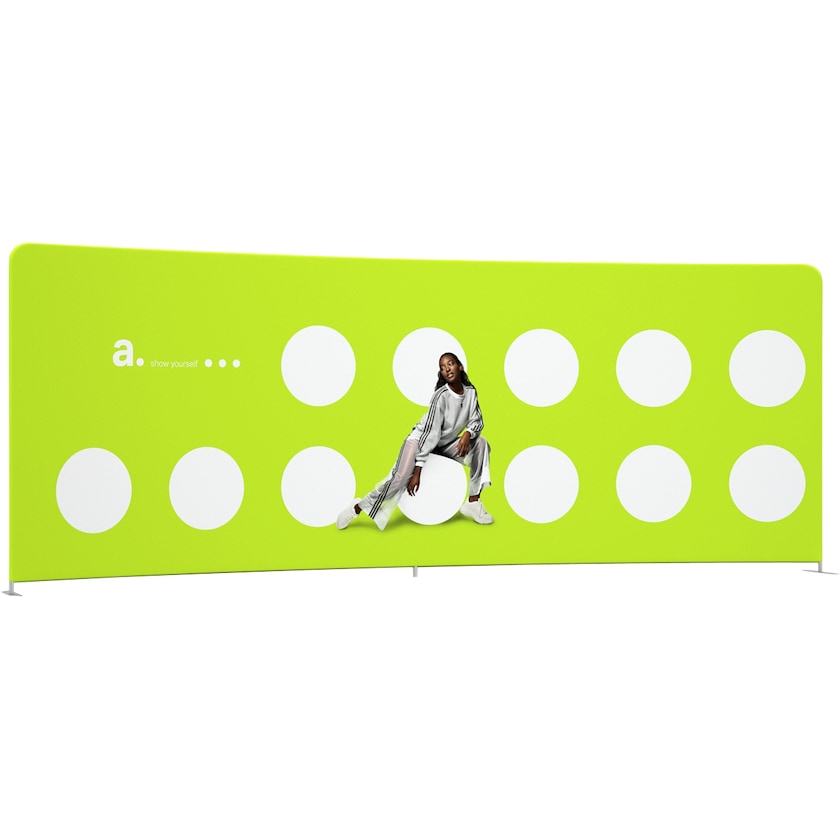 Espositore a parete leggermente curvo largo 600 cm. La forma curva conferisce all'espositore un interessante effetto 3D. La struttura è costituita da tubi di alluminio che si montano in un arco. Il montaggio non richiede alcun attrezzo. Il tessuto, fornito con la tua stampa, si tira poi sull'arco e si chiude con una cerniera. Il tessuto viene personalizzato con colori ecologici a base d'acqua su entrambi i lati. Se per sfortuna il tessuto si dovesse macchiare puoi lavarlo in lavatrice a 30 gradi. Se in futuro vorrai rinnovare la fantasia dell'espositore puoi semplicemente ordinare da noi un nuovo tessuto personalizzato.
