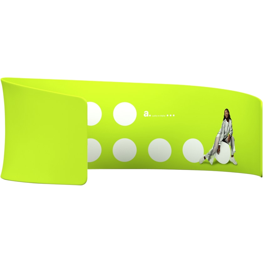 Grande espositore a parete arrotondato largo 650 cm. La forma tonda crea una superficie che crea un effetto stanza. Grazie alla pratica costruzione in tubi di alluminio che si incastrano insieme l'espositore può essere montato senza attrezzi. Dopo aver montato i tubi di alluminio in un arco si tira il tessuto sull'arco e si chiude con una cerniera. Il tessuto viene personalizzato con colori ecologici a base d'acqua sia sul lato anteriore che posteriore. Il tessuto può essere lavato in lavatrice a 30 gradi. Se vorrai cambiare la fantasia ti basterà ordinare un nuovo tessuto.