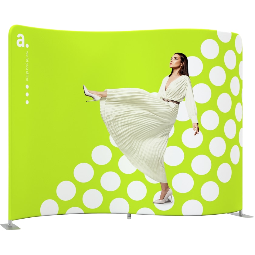 Espositore a parete largo 300 cm con interessante forma a serpentina. Un espositore a parete che attira l'attenzione solo con la sua forma! L'espositore ha una forma morbidamente ondulata con una struttura in tubi di alluminio che si monta in un arco. Il montaggio dell'arco non necessita di alcun attrezzo. Il tessuto, personalizzato completamente secondo le tue istruzioni, si tira sopra l'arco e si chiude con una cerniera. Non è più complicato di così! Il tessuto viene personalizzato con colori a base d'acqua su entrambi i lati. Se necessario il tessuto può essere lavato in lavastoviglie a 30 gradi. Se in futuro vorrai rinnovare la fantasia puoi semplicemente ordinare un nuovo tessuto personalizzato da noi.