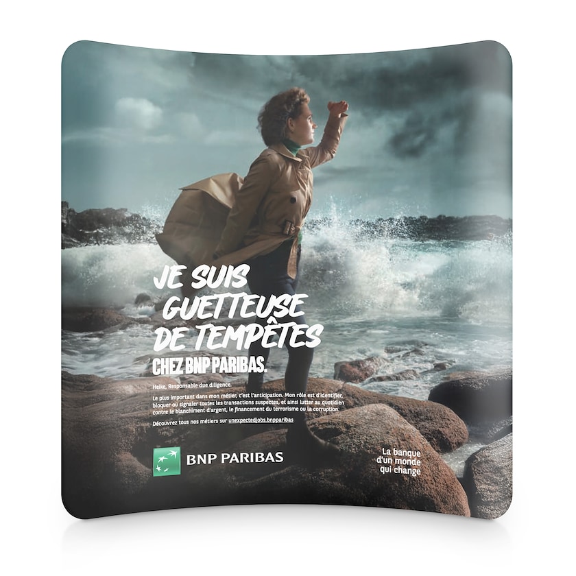 Espositore a parete curvo di tipo softwall. Softwall Small consiste di un telaio tubolare con sezioni in alluminio che si montano facilmente in un espositore a parete con una forma morbida. Il tessuto si applica sul telaio tubolare formando un espositore a parete dalla forma morbida e qualità di stampa imbattibile. Il montaggio è semplice e non richiede alcun attrezzo. Il vantaggio di questo sistema è che è facile cambiare fantasia cambiando il tessuto. Il prezzo di stampa si riferisce alla stampa sul lato anteriore. Consegnato in una pratica borsa. Garanzia di 5 anni sulla costruzione in alluminio.