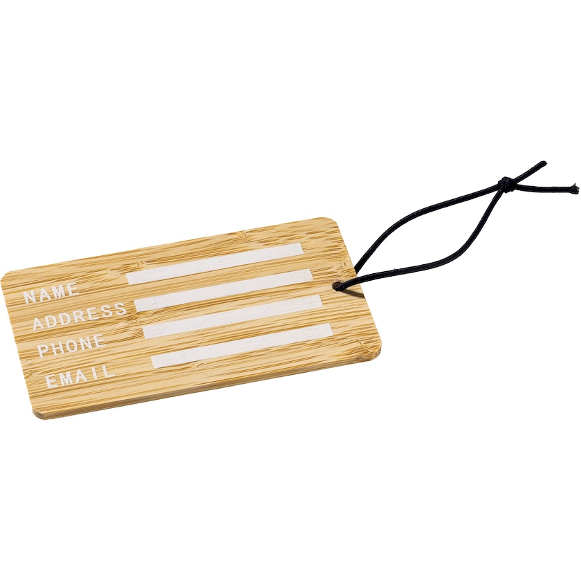 Etichetta per valigia in bambù. L'etichetta per valigia ha uno spazio dove puoi inserire il tuo nome, numero di telefono e indirizzo e-mail. Stampa possibile a un solo colore.