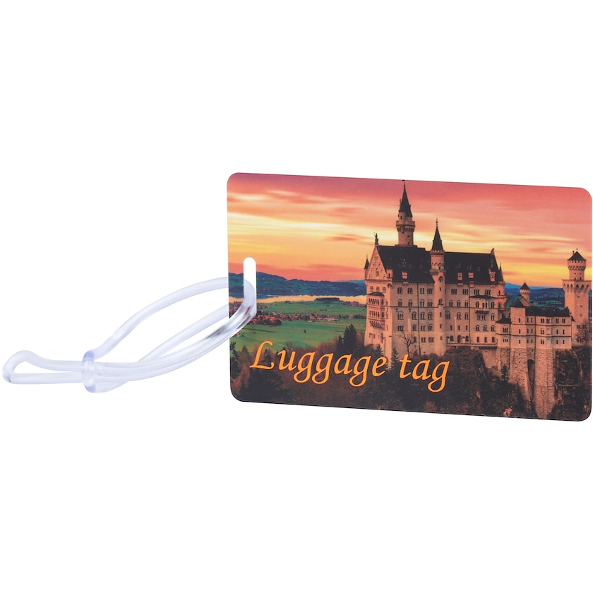Etichetta per bagagli con stampa digitale su entrambi i lati. Questa etichetta per bagagli ha la stessa forma e dimensioni di una carta di credito. Grazie al laccio in silicone di cui è dotata, può essere fissata al bagaglio.