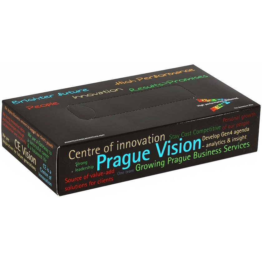 Scatola di cartoncino con 100 fazzoletti. I fazzoletti sono a due strati e sono completamente realizzati in cellulosa. L'intera confezione viene stampata secondo i tuoi desideri.