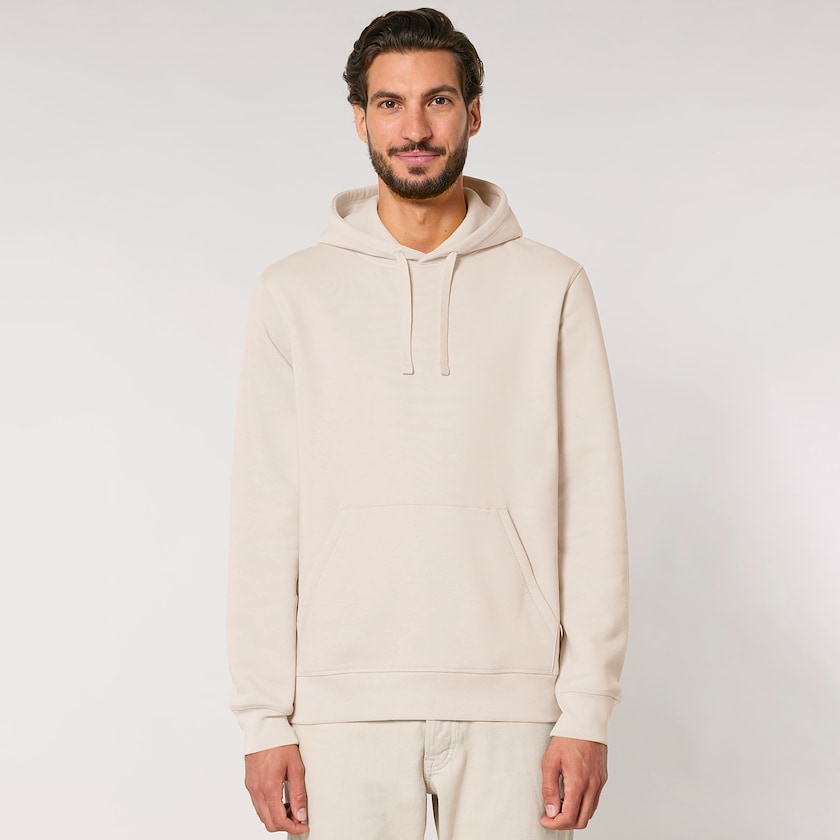 Tasca con cappuccio in modello unisex in materiale ecologico. La felpa ha una grande tasca sulla pancia e laccetti piatti al collo. Il tessuto è realizzato in 85% cotone ecologico e 15% poliestere riciclato.