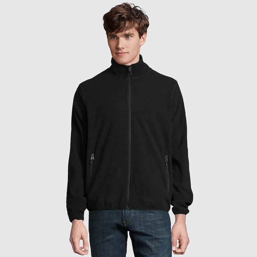 Felpa in pile ecologica da uomo acquistabile da soli 5 pz. Sui lati si trovano delle tasche dotate di cerniera. Il tessuto è in 100% poliestere riciclato.
