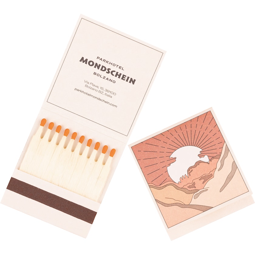 Classica bustina di fiammiferi in cartone lucido. Stampa fino a 4 colori secondo la scala Pantone e dai 5 in su in quadricromia (CMYK). Scegli tra 16 diversi colori della capocchia e 7 diversi colori del legno.