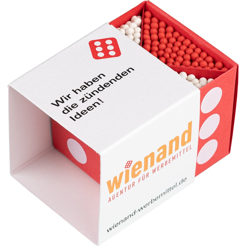 Grande scatola di fiammiferi con 200 fiammiferi. I fiammiferi sono divisi in quattro diversi scomparti. L'intera scatola viene personalizzata secondo i tuoi desideri. Puoi scegliere tu stesso tra 16 colori della capocchia e 3 diversi colori del legno.