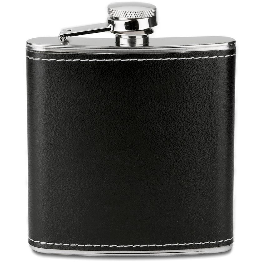 Elegante fiaschetta tascabile in metallo e pelle sintetica. Da 18 cl. Personalizzabile con incisione laser sulla superficie in pelle sintetica.
