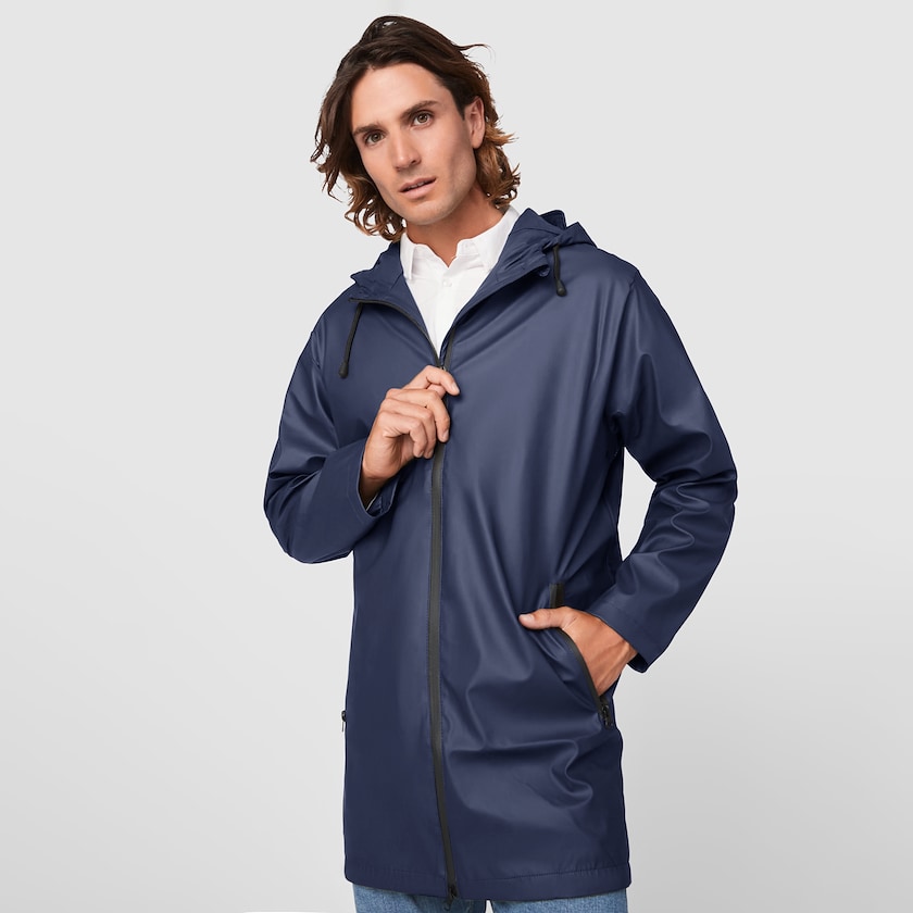 Giacca impermeabile con cappuccio in modello da uomo. La giacca è idrorepellente e ha due tasche laterali con cerniera. Roly veste stresso quindi consigliamo di scegliere una misura più grande se normalmente sei tra due taglie diverse. Disponibile anche in versione da donna.
