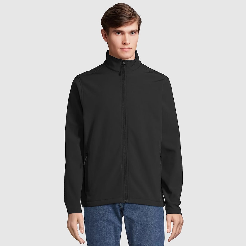 Giacca sportiva softshell da uomo. Sui lati si trovano delle tasche dotate di cerniera. Il tessuto è composto da due strati ed è realizzato in 96% poliestere e 4% elastane. La fodera è in 100% poliestere.