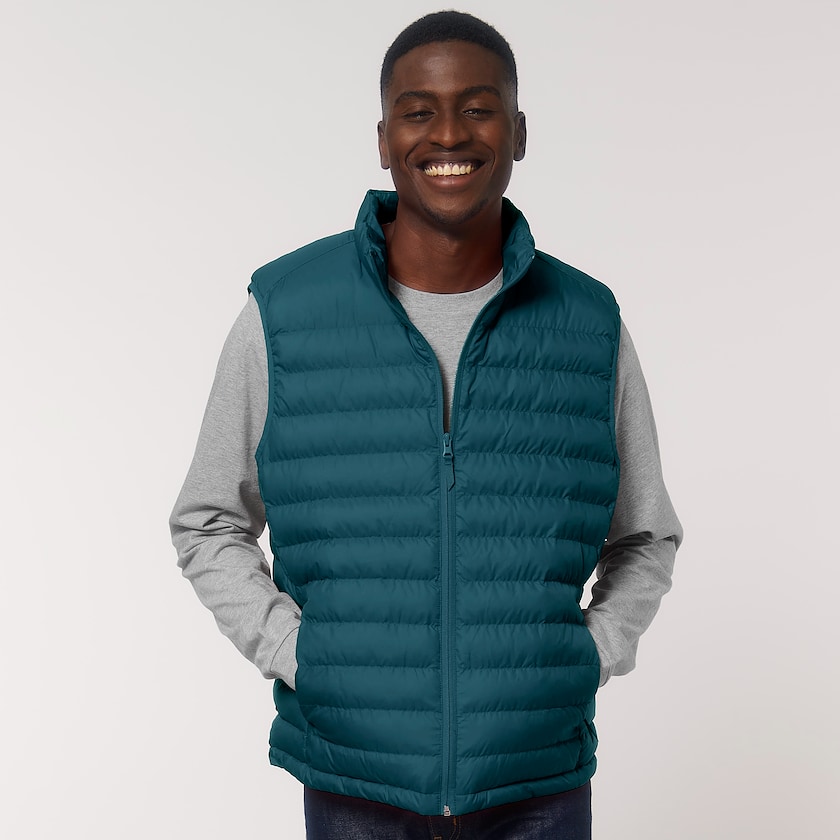 Gilet in poliestere riciclato. Questo gilet ha un colletto alto e tasche laterali dotate di cerniera. Il prezzo del ricamo si riferisce a un piccolo ricamo sul petto. Disponibile anche in versione da donna.