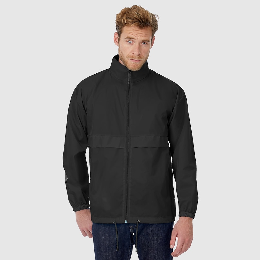 Giacca antivento molto economica, con logo, di marca B&C. Design classico con zip e cappuccio nascosto nel colletto. Sia il cappuccio sia la vita sono regolabili. La giacca non è foderata. Disponibile anche in versione da donna.