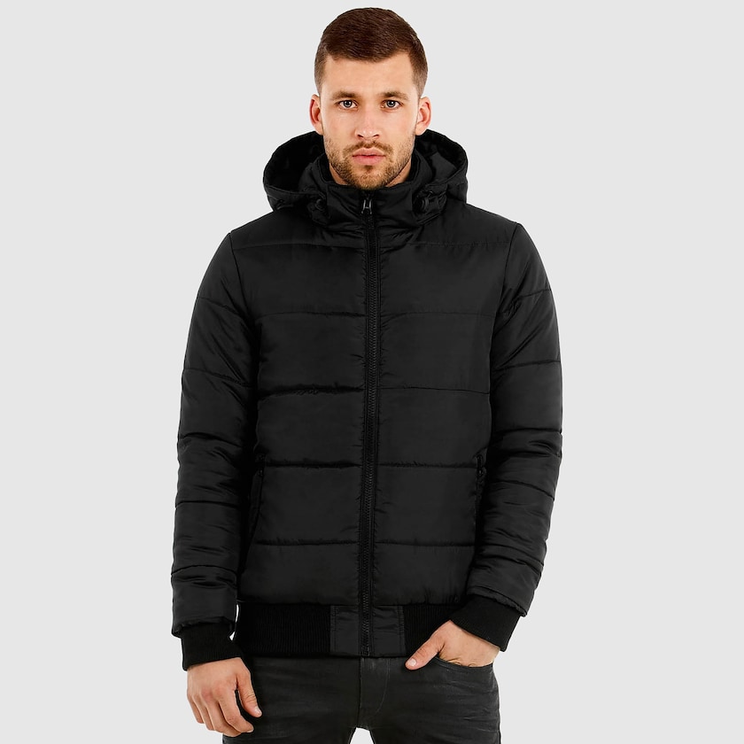 Giacca invernale foderata con cappuccio ed interno di colore a contrasto. La giacca è realizzata in poliestere 300T resistente al vento ed ad altri agenti atmosferici. Con due tasche esterne con zip ed una tasca interna. Polsini elastici ed elastico in vita, colletto dritto e cappuccio rimovibile. Disponibile anche in versione da donna.