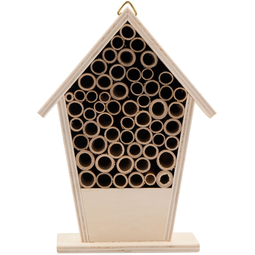 Casetta per insetti per un giardino rigoglioso. La casetta è fatta di plywood e canne. La personalizzazione è realizzata con incisione a laser.