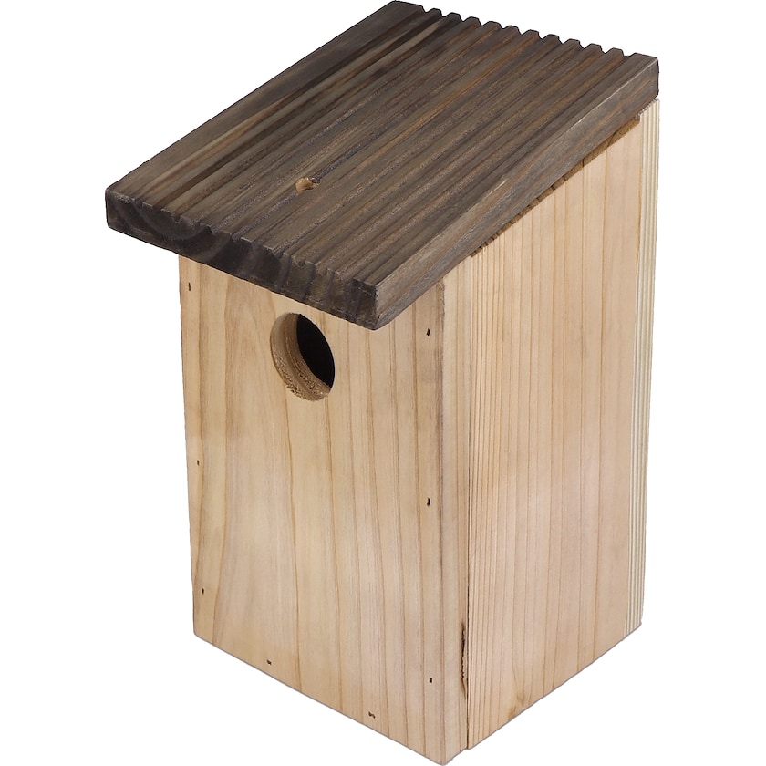 Casetta per uccelli rustica in legno. L'apertura misura 30 mm ed è quindi l'ideale per i piccoli uccelli. Il legno è certificato FSC. Il logo viene inciso a laser.