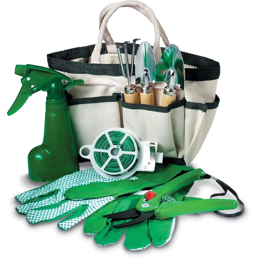 Set grande per il giardinaggio, composto da 8 pezzi. Con custodia di cotone, guanti da giardinaggio, forbici, rastrello, contenitore spray, due palette e spago da giardino. Personalizzabile con logo stampato sulla custodia.