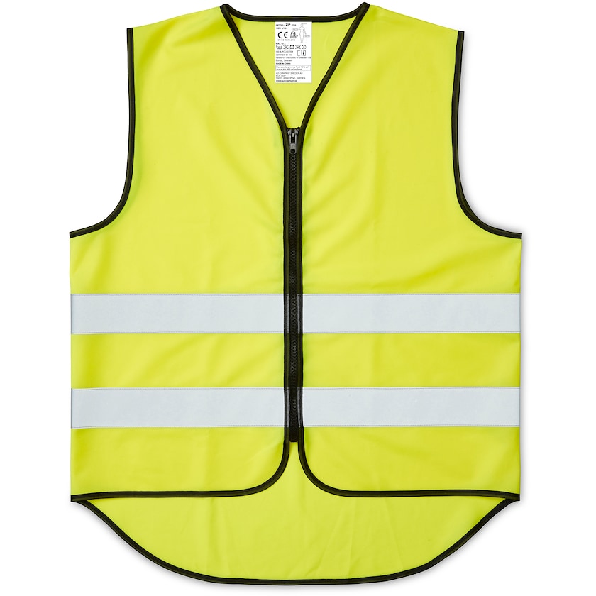 Gilet alta visibilità con zip robusta. Questo modello è unisex ed ha dei catarifrangenti larghi 5 cm di classe 2. Con custodia. Ordina i tuoi gilet alta visibilità con logo da Axon Profil!