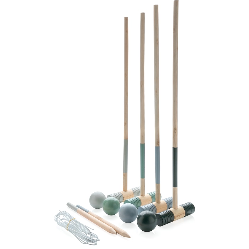 Gioco croquet dal bel design. Il set contiene 4 mazze da croquet, 4 bocce da croquet, 2 picchetti e 10 archi di metallo. Sono incluse una custodia in cotone e un libretto delle istruzioni. La stampa viene realizzata sulla custodia.