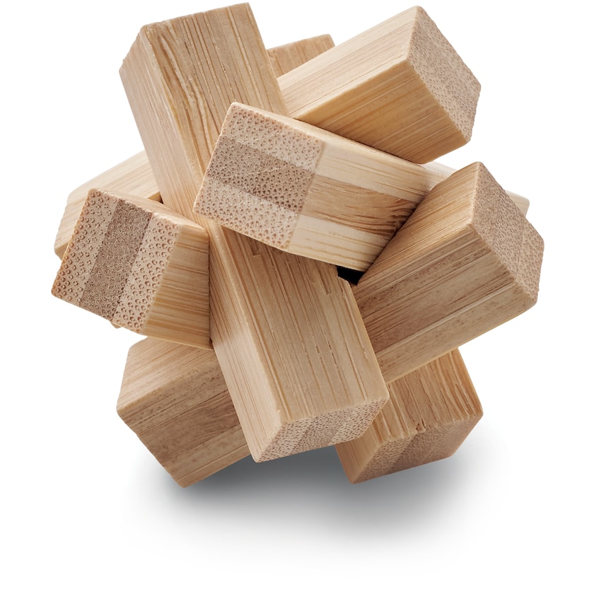 Rompicapo a forma di stella in bambù. Consegnato un una scatola di cartone riciclato. Il logo viene stampato sulla scatola.