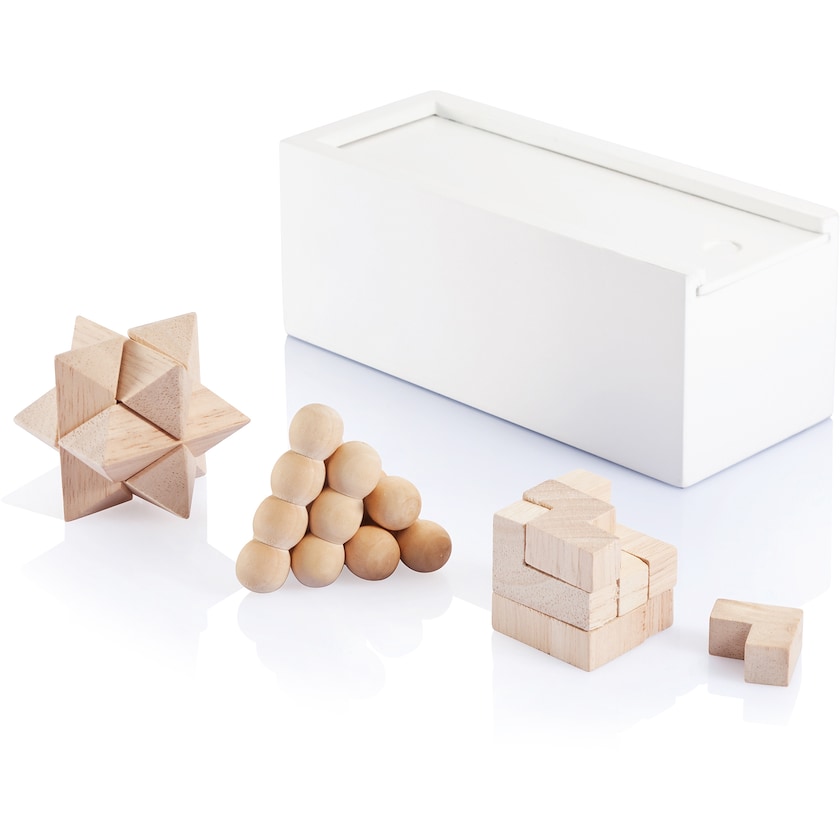 Set con 3 puzzle 3D per allenare la mente. Il set e la cassetta sono realizzati in legno. Personalizzabile con stampa sulla cassetta. In confezione regalo.