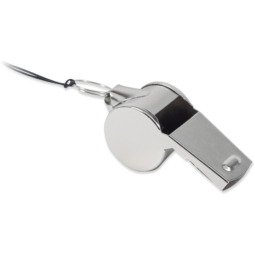 Fischietto in metallo. Il fischietto è consegnato con un cordino. La personalizzazione può essere realizzata con stampa o incisione a laser.