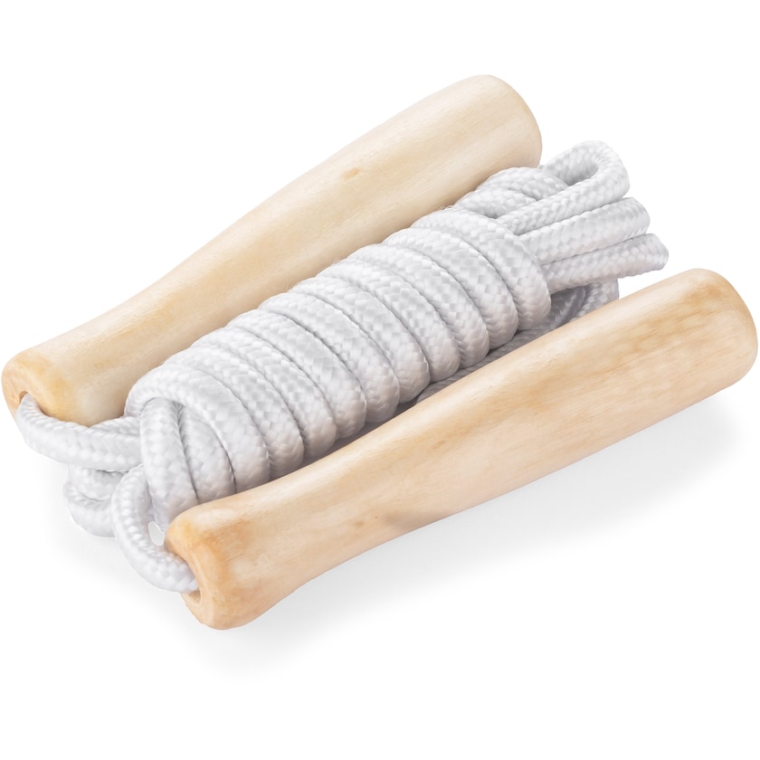 Corda per saltare per grandi e piccini. Questa corda per saltare è dotata di manici in legno, mentre la corda è realizzata in poliestere. Il logo viene stampato oppure inciso a laser su uno dei due manici.