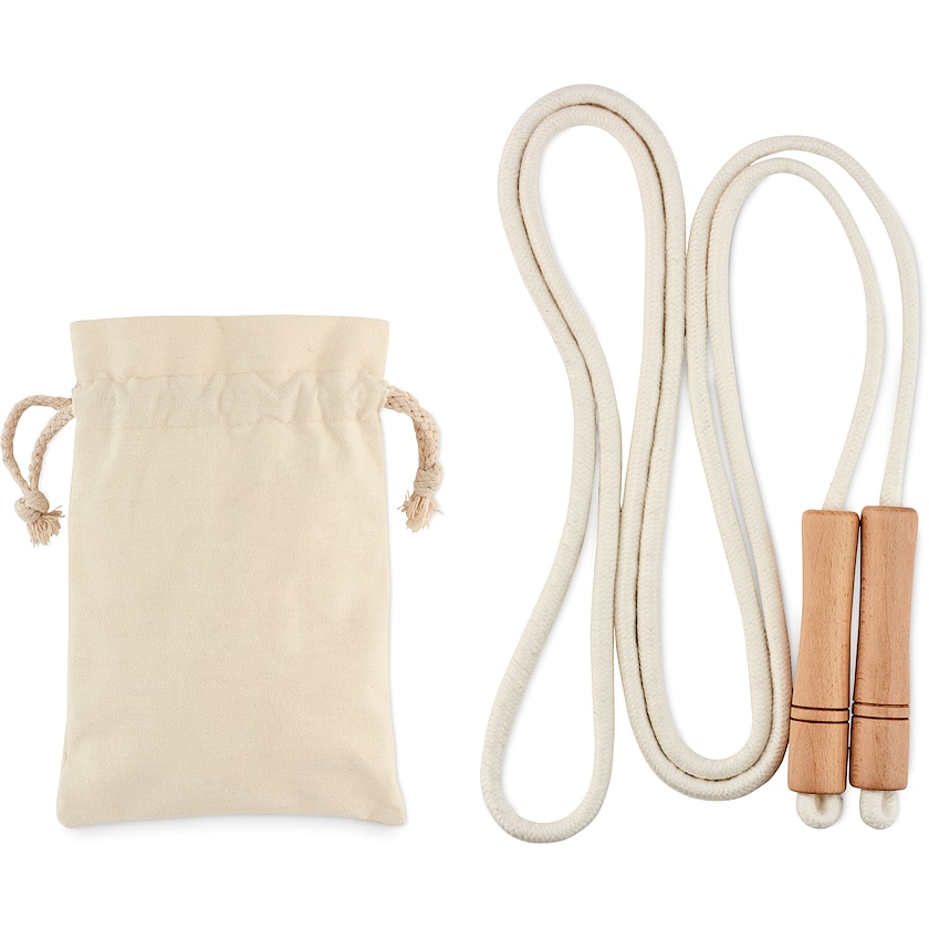 Corda per saltare in cotone con manici in legno. La corda per saltare viene consegnata all'interno di una busta di cotone color naturale. La stampa viene realizzata sulla busta, mentre l'incisione a laser sui manici.