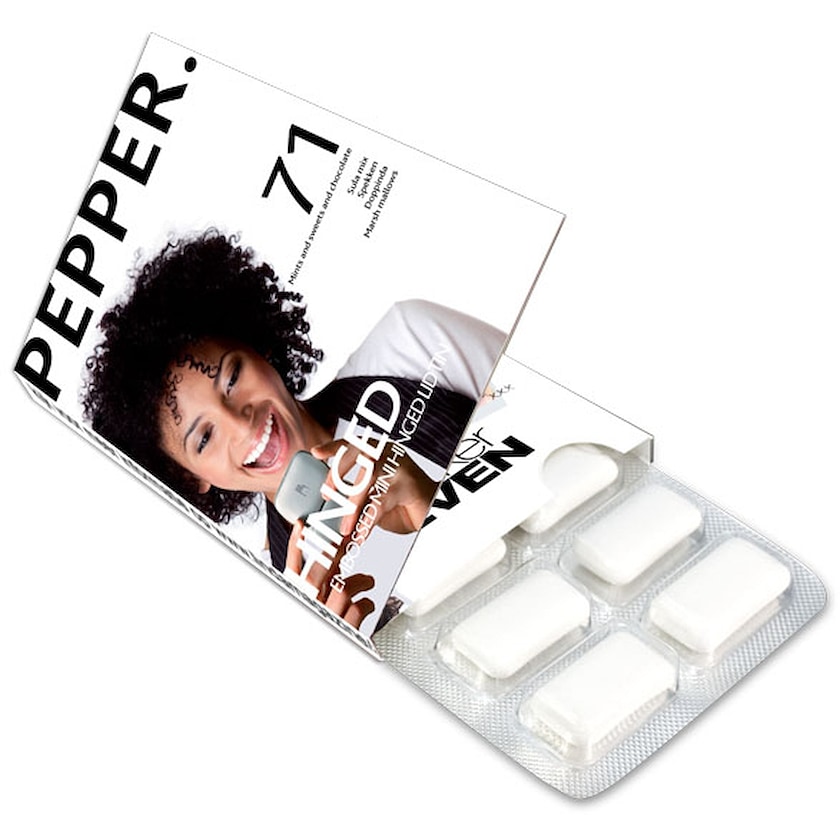 12 gomme da masticare alla menta, senza zucchero, con xilitolo. Questa confezione ha una copertina extra, perfetta per stampare il tuo logo!