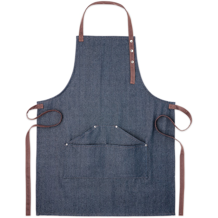 Grembiule in denim con fibbie in cotone marrone. Il denim dà al grembiule un tocco moderno. Sul davanti si trovano tre tasche. Ogni grembiule viene confezionato singolarmente in una scatola regalo di cartone.