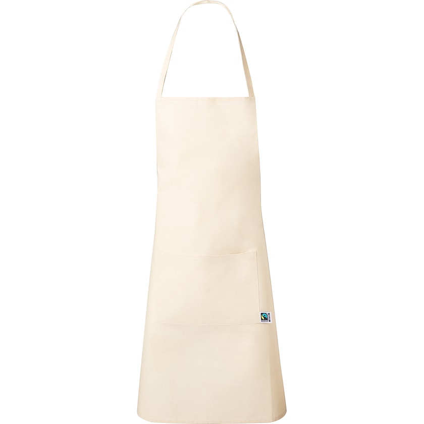 Grembiule in cotone certificato Fairtrade. Sul davanti si trova una tasca grande dotata di etichetta che indica la composizione del grembiule in cotone certificato Fairtrade.