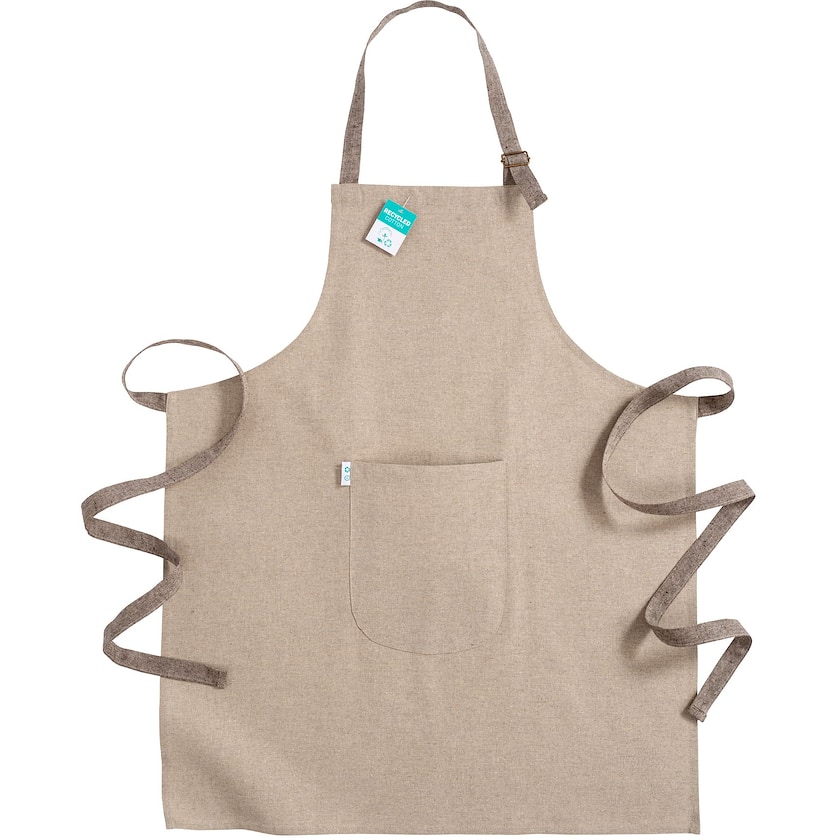 Grembiule lungo in cotone riciclato. Sulla tasca anteriore è posizionata un'etichetta che indica la composizione del grembiule in cotone riciclato.