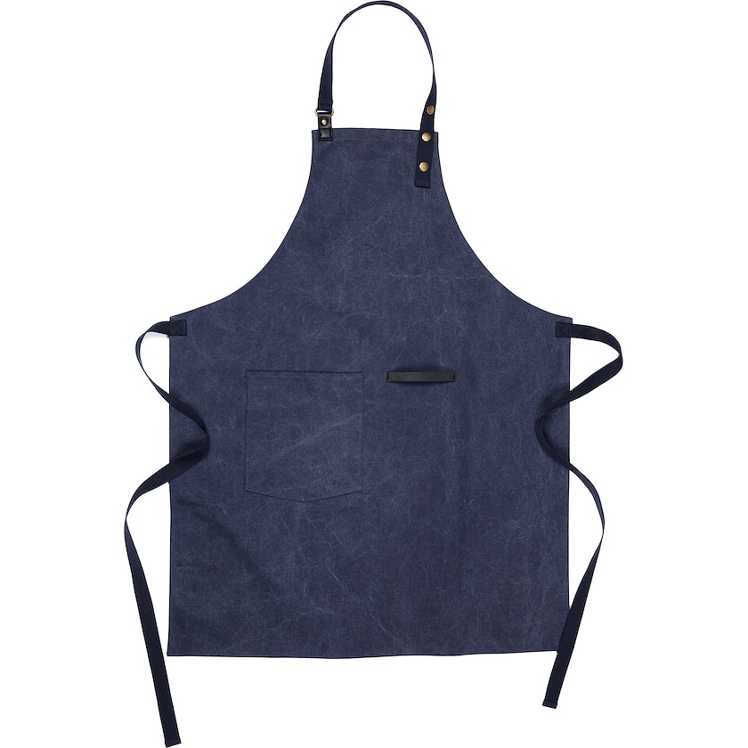 Grembiule esclusivo in tela di cotone riciclato. Il tessuto è realizzato all'87% in materiale riciclato. Sul davanti si trova una tasca con un occhiello per appendere attrezzi o strofinacci. Questo grembiule è dotato anche di un collo morbido e regolabile.