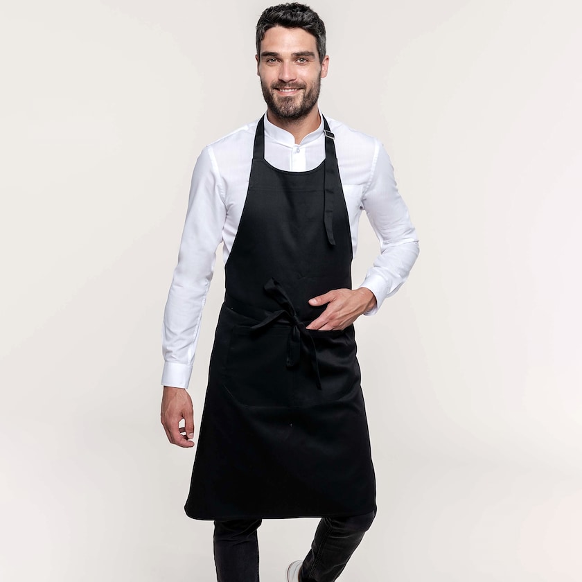 Grembiule per uso professionale in grado di resistere al lavaggio industriale. Il grembiule può sopportare il lavaggio in lavatrice ordinaria fino a 60 gradi e il lavaggio industriale fino a 85 gradi secondo ISO 15797. Sul davanti si trova una grande tasca con due scomparti. Il grembiule misura 90 cm in lunghezza e 76 in larghezza.