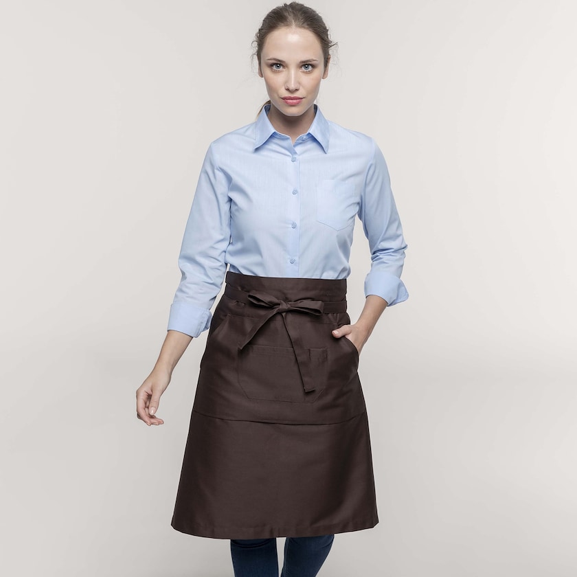 Grembiule in resistente miscela di poliestere. Il grembiule ha una tasca sul davanti e una tasca aggiuntiva che è divisa in due spazi di archiviazione. La lunghezza è di 62,5 cm e la larghezza è di 90 cm.