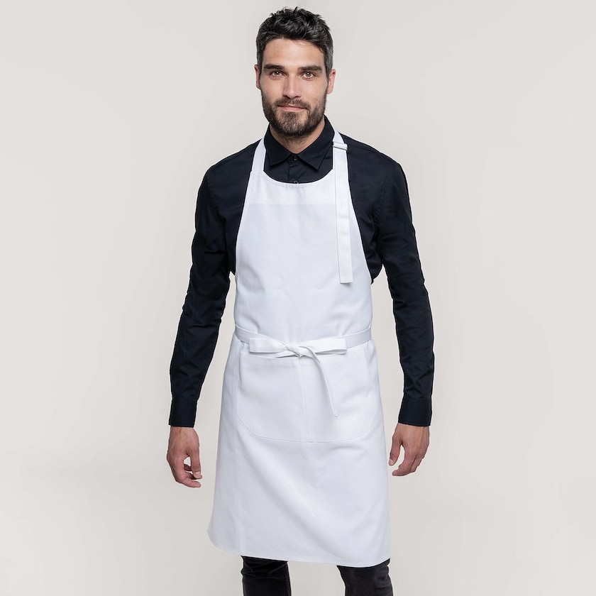 Grembiule di alta qualità in grado di resistere al lavaggio ad alta temperatura. Il grembiule ha un tessuto altamente resistente. Nella lavatrice ordinaria, il lavaggio fino a 60 gradi e nel lavaggio industriale fino all'85% avviene secondo la norma ISO 15797. Il grembiule ha una lunghezza di 90 cm e una larghezza di 76 cm.