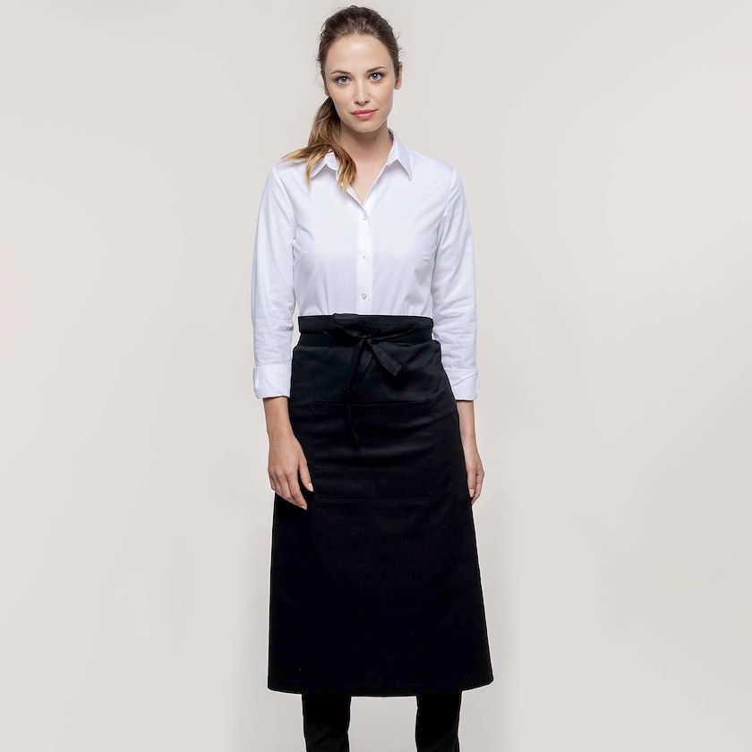 Grembiule di alta qualità lungo. Il grembiule è realizzato in resistente miscela di poliestere. Nella parte anteriore c'è una grande tasca con tasca per penna integrata. Il grembiule ha una lunghezza di 80 cm e una larghezza di 90 cm.