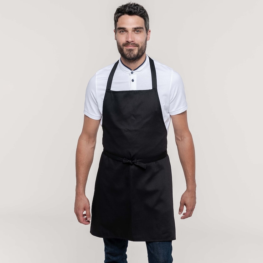 Grembiule elegante senza tasche Il grembiule è realizzato in resistente tessuto di poliestere e cotone. La lunghezza è di 77 cm e la larghezza è di 66 cm.