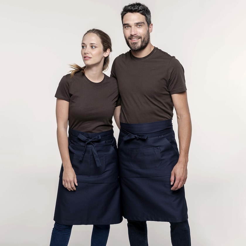 Grembiule corto in cotone 100% con due tasche. Il grembiule ha una lunghezza di 90 cm e una larghezza di 62,5 cm. Disponibile in molti bei colori.