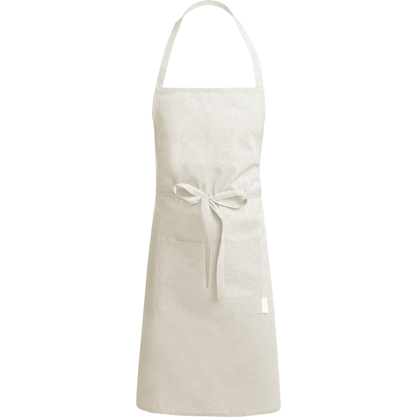 Grembiule lungo personalizzato in 100% cotone riciclato. Sul davanti si trova un'ampia tasca. Inoltre, è attaccata al grembiule una piccola etichetta che ne mostra la composizione in cotone riciclato.