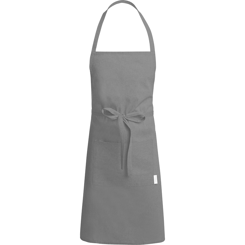 Grembiule lungo personalizzato in 100% cotone riciclato. Sul davanti si trova un'ampia tasca. Inoltre, è attaccata al grembiule una piccola etichetta che ne mostra la composizione in cotone riciclato.